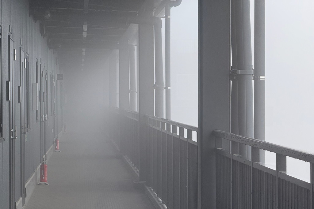 走行開始の時間になりましたが、雨は濃霧へと変わります。