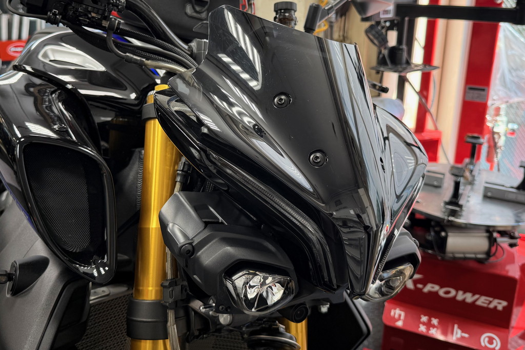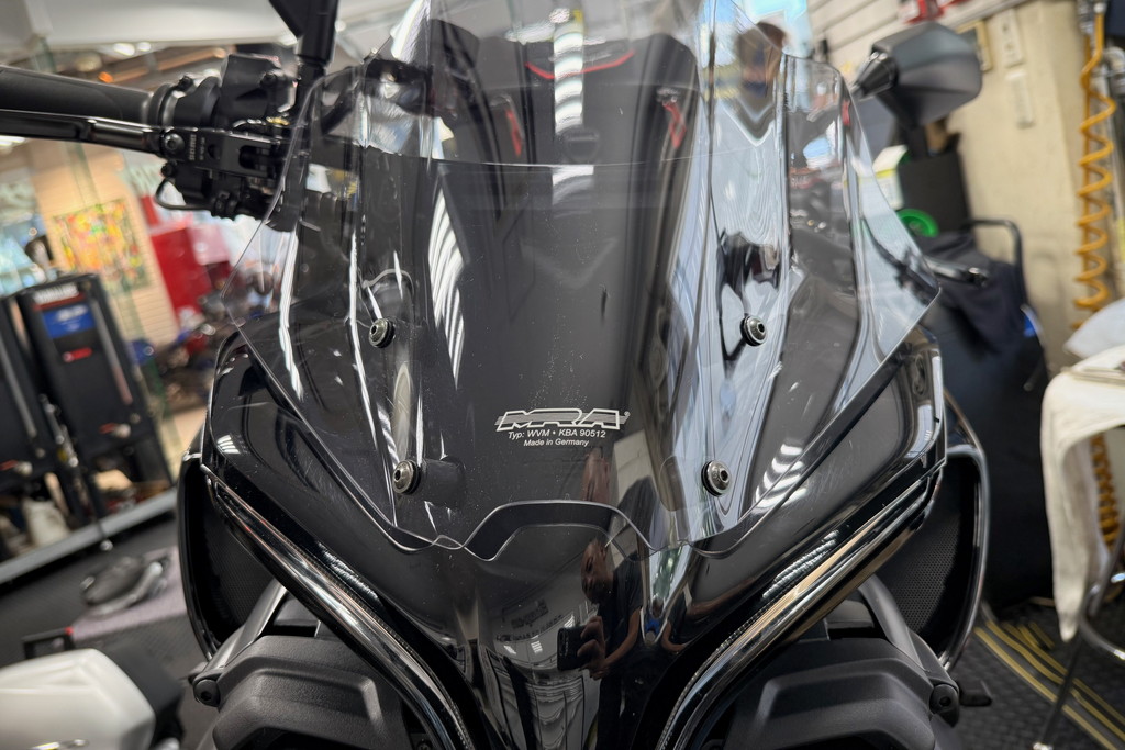 純正スクリーンのデザインは気に入っているのですが、200km/h超の速度域での風防効果を、もう少し高めたいと考えたからです。
