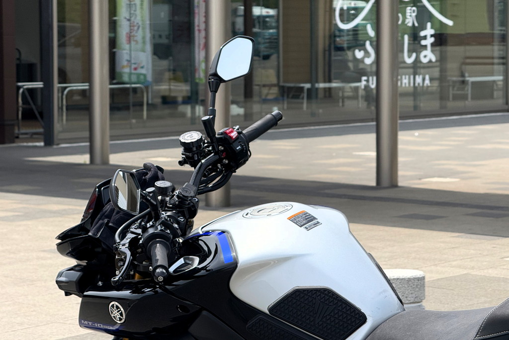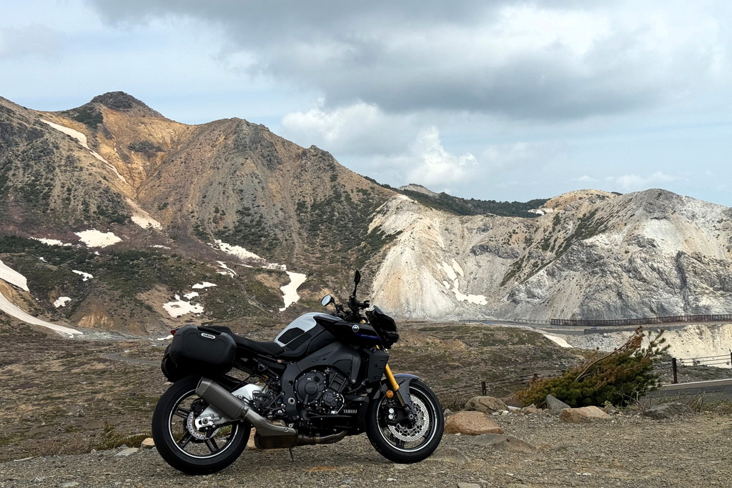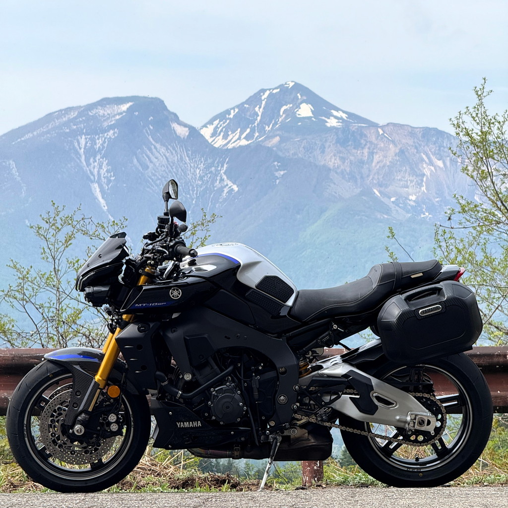 見晴らしの良い場所でMT-10SPを停めて、雄大な磐梯山をバックに記念撮影。