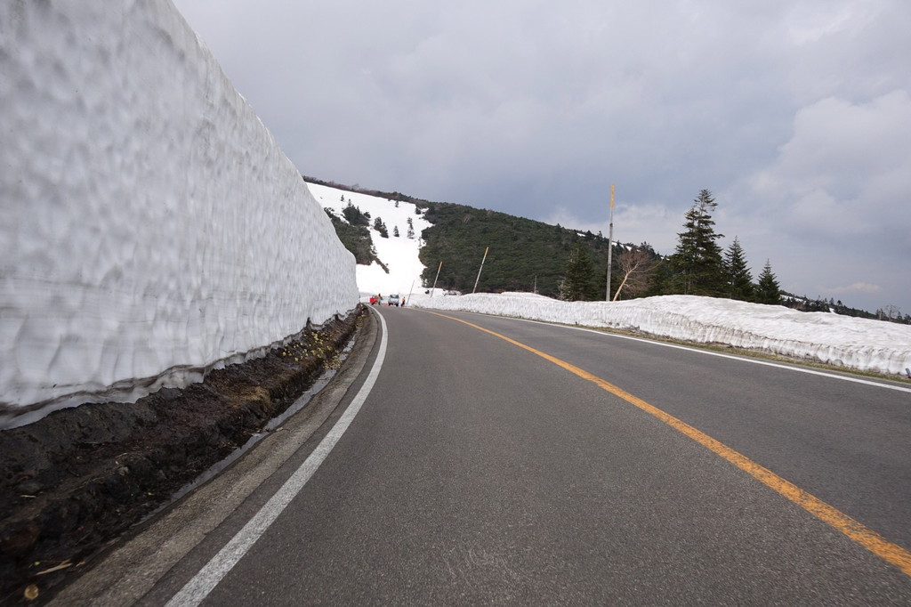 高度が上がるにつれ、路肩の残雪はどんどん増加。やがて雪の壁が現れました。